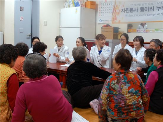 서울여자간호대 ‘누리보듬’동아리 학생들은 매월 한 차례씩 정원경로당과 홍연경로당을 방문, ▲혈압, 혈당, 맥박, 체온, 측정 ▲영양 상담 ▲우울증 간이검사 ▲치매 예방운동 교육 등 어르신 건강을 위한 자원봉사 활동을 펼친다.