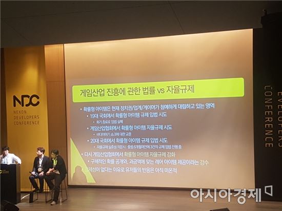 26일 NDC 2017의 '게임 관련 법령 리뷰 2017' 세션에서는 이 같은 분위기가 그대로 연출됐다. 이 세션에 참석한 게임업계 관계자들은 넥슨의 공식 입장과는 관계없이 법조계와 개발자 등의 입장에서 관련 제도에 대한 의견을 자유롭게 주고받았다. 특히 확률형아이템 규제를 두고 "19대 국회에 이어 20대 국회에서도 입법시도가 이어졌고 6개월만에 3건의 입법이 발의되는 등 점차 강화되고 있다"며 "게임산업협회가 자율규제 강화안을 내놨지만 강제성이 없다는 이유로 유저들의 반응은 미온적"이라는 지적이 나왔다.
