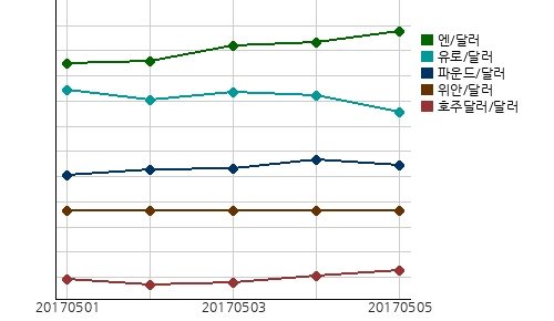 5월 5일 12시 현재 국제시장환율은 달러/유로 환율은 전일대비 0.35%(0.0039달러) 오른 1유로에 1.0944달러이고, 달러/영국 파운드 환율은 전일대비 0.13%(0.0017달러) 오른 1파운드에 1.2916달러이고, 중국 위안/달러 환율은 전일대비 0.01%(0.0013위안) 내린 1달러에 6.8962위안이고, 일본 엔/달러 환율은 전일대비 0.34%(0.3900엔) 오른 1달러에 112.6900엔이다