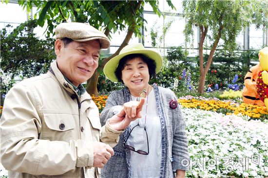 [아시아경제 노해섭 기자]윤장현 광주시장은 부인 손화정 여사와 함께 휴일인 6일 함평나비축제가 열리고 함평엑스포공원을 방문, 나비 생태관에서 나비를 손가락에 얹고 기념촬영을 하고 있다.