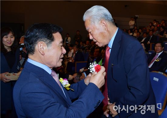 [아시아경제 노해섭 기자]윤장현 광주광역시장이 8일 오전 남구 빛고을시민문화관 공연장에서 열린 ‘제45회 어버이날’ 기념행사에 참석해 대한노인회 광주지회 오병채 회장에게 ‘감사의 카네이션’을 달아주고 있다.
