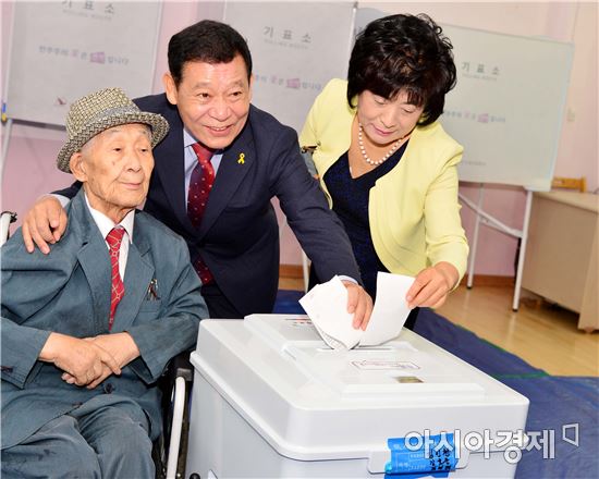 [아시아경제 문승용 기자]윤장현 광주광역시장은 제19대 대통령 선거일인 9일 오전 9시께 부친 윤지혁(93) 씨, 배우자 손화정 여사와 함께 광주광역시 동구 청소년수련관 1층 아람실에 마련된 제1투표소를 찾아 소중한 한표를 행사했다.