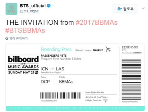 9일 방탄소년단 측은 21일 오후 8시(현지시간) 미국 라스베이거스 T-모바일 아레나에서 열리는 '2017 빌보드 뮤직 어워드(The 2017 Billboard Music Awards)'에 공식적으로 초청받아 참석을 확정했다고 말했다.