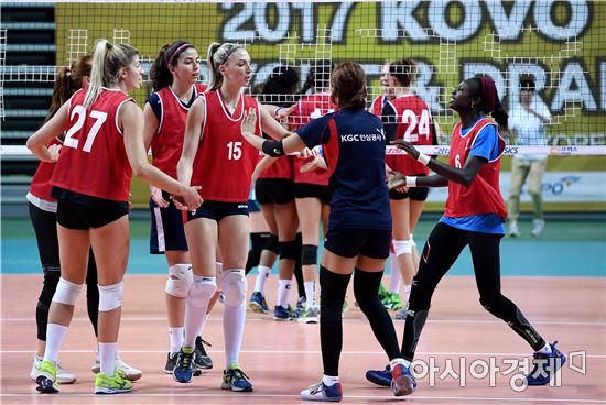 [아시아경제 김현민 기자]10일 서울 중구 장충체육관에서 열린 2017 한국배구연맹(KOVO) 여자부 트라이아웃(외국인 공개선발)에서 참가자들이 실력을 겨루고 있다.