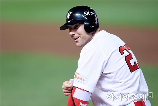[인천=아시아경제 김현민 기자]프로야구 KIA 타이거즈와 SK와이번스의 2017 KBO리그 경기가 12일 인천 SK행복드림구장에서 열렸다. 8회말 무사 1루에서 SK 로맥이 유격수 내야 안타를 치고 출루한 뒤 미소 짓고 있다.