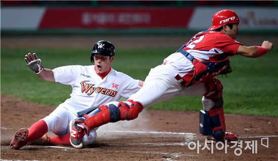 [인천=아시아경제 김현민 기자]프로야구 KIA 타이거즈와 SK와이번스의 2017 KBO리그 경기가 12일 인천 SK행복드림구장에서 열렸다. 8회말 1사 만루에서 SK 박승욱의 2루수 땅볼 때 3루주자 노수광이 포스아웃 되고 있다. KIA 포수는 김민식.