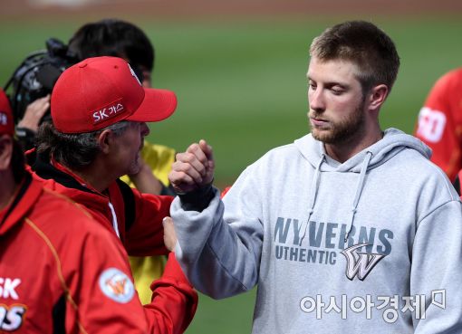 [인천=아시아경제 김현민 기자]프로야구 KIA 타이거즈와 SK와이번스의 2017 KBO리그 경기가 12일 인천 SK행복드림구장에서 열렸다. SK 켈리가 8-2 승리를 확정한 뒤 힐만 감독과 기뻐하고 있다. 켈리는 선발 등판해 7이닝 2실점 호투로 시즌 3승을 챙겼다.