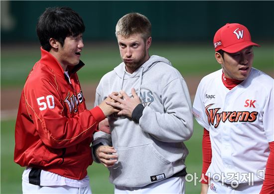 [인천=아시아경제 김현민 기자]프로야구 KIA 타이거즈와 SK와이번스의 2017 KBO리그 경기가 12일 인천 SK행복드림구장에서 열렸다. SK 켈리가 8-2 승리를 확정한 뒤 박종훈의 축하를 받고 있다. 켈리는 선발 등판해 7이닝 2실점 호투로 시즌 3승을 챙겼다.