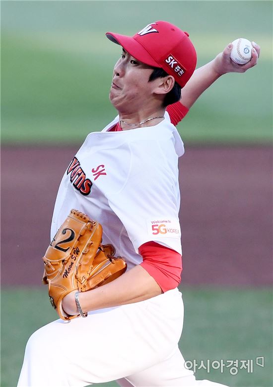 [인천=아시아경제 김현민 기자]프로야구 삼성 라이온즈와 SK와이번스의 2017 KBO리그 경기가 16일 인천 SK행복드림구장에서 열렸다. SK 선발투수 문승원이 역투하고 있다.