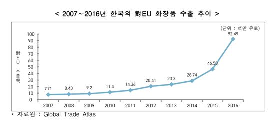 17일 코트라에 따르면 최근 한국의 대(對) 유럽연합(EU) 화장품 수출 규모는 2009년 920만유로(한화 114억원)에서 지난해 9249만유로(한화 1143억원)로, 10배 이상 급증했다.