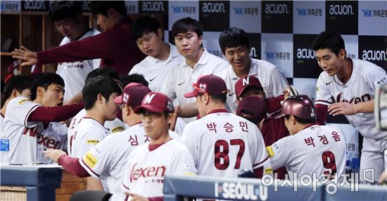 [아시아경제 김현민 기자]프로야구 한화 이글스와 넥센 히어로즈의 2017 KBO리그 경기가 17일 서울 고척돔에서 열렸다. 1회초 1사 3루에서 넥센 윤석민의 선취 1타점 적시타 때 득점을 올린 박정음이 동료들의 환영을 받고 있다.