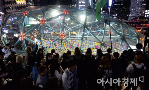 [아시아경제 문호남 수습기자] 강남역 여성 살인 사건 1주기인 17일 서울 강남구 신논현역 6번 출구 앞에서 열린 추모문화제에 참가한 시민들이 강남역 10번 출구 방향으로 행진을 마치고 추모의 문구를 부착하고 있다.