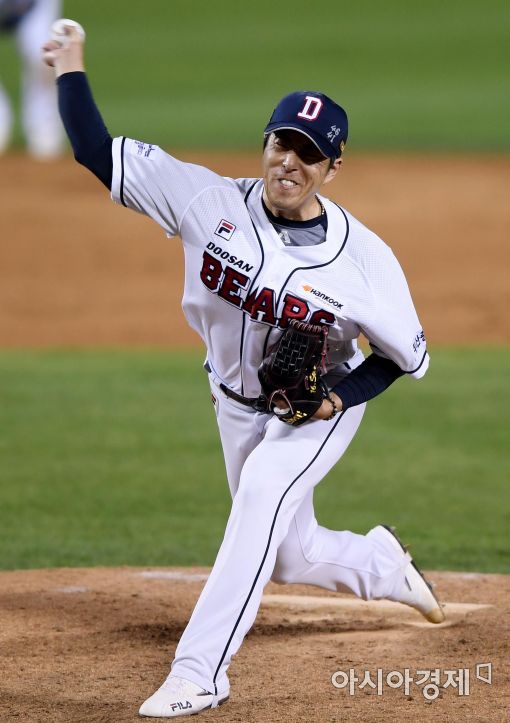 [아시아경제 김현민 기자]프로야구 NC 다이노스와 두산 베어스의 2017 KBO리그 경기가 18일 잠실구장에서 열렸다. 4회초 두산 구원투수 김승회가 역투하고 있다.