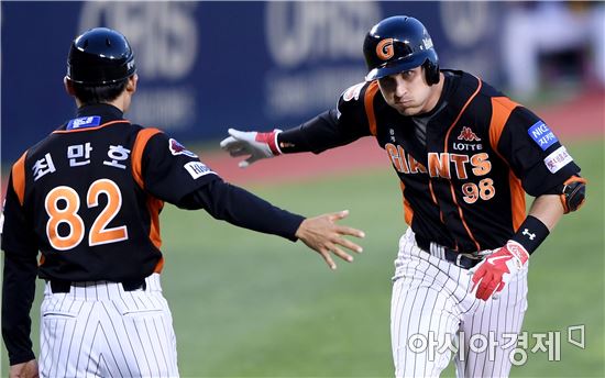 [아시아경제 김현민 기자]프로야구 롯데 자이언츠와 LG 트윈스의 2017 KBO리그 경기가 19일 잠실구장에서 열렸다. 4회초 1사 1,2루에서 롯데 번즈가 LG 선발 허프를 상대로 역전 3점 홈런을 치고 최만호 코치와 하이파이브하고 있다.