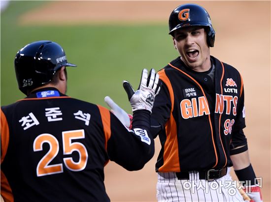 [아시아경제 김현민 기자]프로야구 롯데 자이언츠와 LG 트윈스의 2017 KBO리그 경기가 19일 잠실구장에서 열렸다. 4회초 1사 1,2루에서 롯데 번즈가 LG 선발 허프를 상대로 역전 3점 홈런을 치고 선행주자 최준석과 하이파이브하고 있다.
