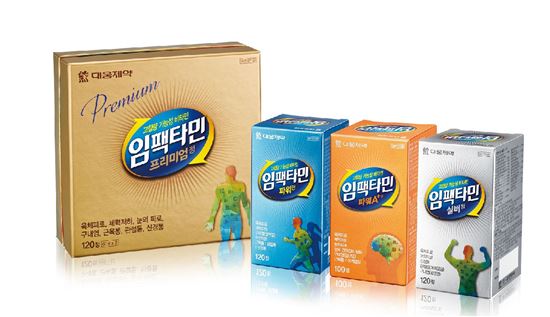 대웅제약이 선보인 '임팩타민'은 활성형비타민B1인 벤포티아민을 포함해 비타민B군 10여종이 고함량으로 함유돼 체력강화에 도움을 준다. '임팩타민 프리미엄'은 비타민B군 10여종과 비타민C·E, 셀레늄 등의 항산화성분을 보강했으며 눈의 피로, 어깨결림, 구내염 등의 증상 개선에 효과적이다.