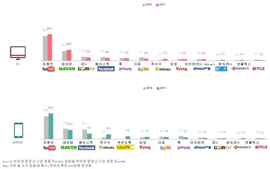 주로 이용하는 동영상 매체는 지난 해에 이어 유튜브가 PC(45.5%)와 모바일(42.8%)에서 독보적인 1위를 차지했다. 네이버 TV캐스트는 PC 18.8%, 모바일 15.4%로 뒤를 이었다. PC이용자는 곰TV(5.9%), 모바일 이용자는 페이스북(9.1%)을 통한 시청 비중이 상대적으로 높았다.