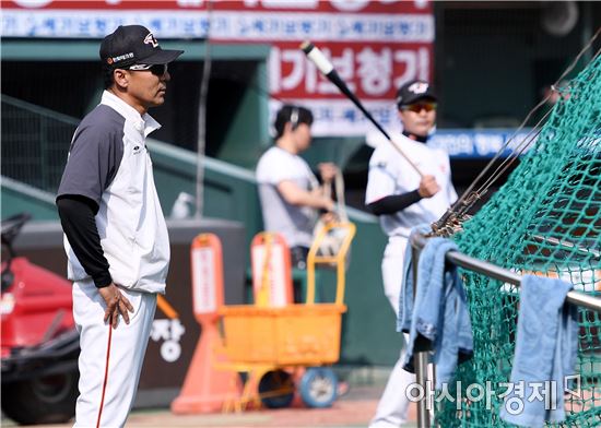 [대전=아시아경제 김현민 기자]24일 대전구장에서 열릴 프로야구 KIA 타이거즈와 한화 이글스의 2017 KBO리그 경기에 앞서 한화 이상군 감독대행이 선수들의 훈련을 바라보고 있다.