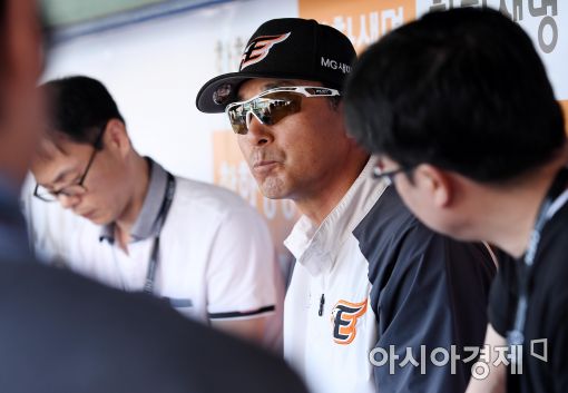 [대전=아시아경제 김현민 기자]24일 대전구장에서 열릴 프로야구 KIA 타이거즈와 한화 이글스의 2017 KBO리그 경기에 앞서 한화 이상군 감독대행이 취재진과 이야기를 나누고 있다.