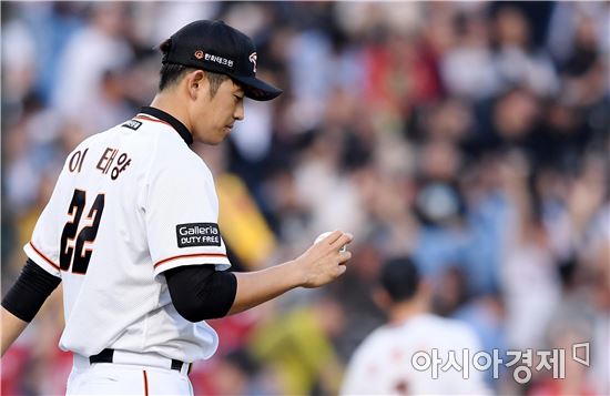 [대전=아시아경제 김현민 기자]프로야구 KIA 타이거즈와 한화 이글스의 2017 KBO리그 경기가 24일일 대전구장에서 열렸다. 2회초 1사 3루에서 한화 선발 이태양이 KIA 김선빈에게 선제 투런포를 허용하고 있다.