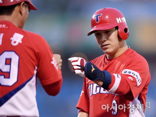 [대전=아시아경제 김현민 기자]프로야구 KIA 타이거즈와 한화 이글스의 2017 KBO리그 경기가 24일일 대전구장에서 열렸다. 3회초 2사 1,3루에서 KIA 김선빈이 추가 1타점 적시타를 치고 김태룡 코치와 하이파이브하고 있다.