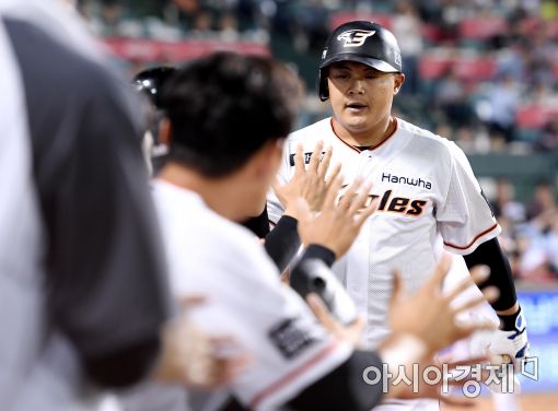 [대전=아시아경제 김현민 기자]프로야구 KIA 타이거즈와 한화 이글스의 2017 KBO리그 경기가 24일일 대전구장에서 열렸다. 5회말 1사에서 한화 양성우가 KIA 선발 임기영을 상대로 우월 솔로 홈런을 치고 동료들과 하이파이브하고 있다.