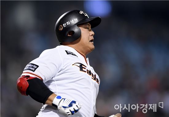[대전=아시아경제 김현민 기자]프로야구 KIA 타이거즈와 한화 이글스의 2017 KBO리그 경기가 24일일 대전구장에서 열렸다. 5회말 1사에서 한화 양성우가 KIA 선발 임기영을 상대로 우월 솔로 홈런을 치고 베이스를 돌고 있다.