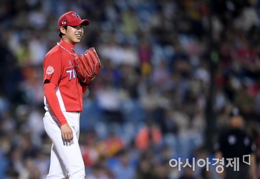 [대전=아시아경제 김현민 기자]프로야구 KIA 타이거즈와 한화 이글스의 2017 KBO리그 경기가 24일일 대전구장에서 열렸다. KIA 선발 임기영이 5회말 1사에서 한화 정근우를 3루 땅볼로 처리한 뒤 야수들을 향해 미소 짓고 있다.