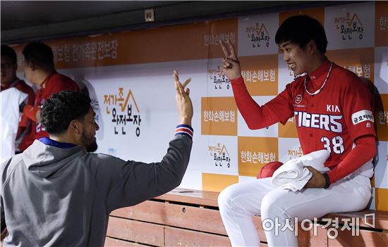 [대전=아시아경제 김현민 기자]프로야구 KIA 타이거즈와 한화 이글스의 2017 KBO리그 경기가 24일일 대전구장에서 열렸다. KIA 선발 임기영이 8회말 고효준과 교체된 뒤 더그아웃에서 헥터와 세리머니하고 있다. 임기영은 7이닝 1실점 호투했다.