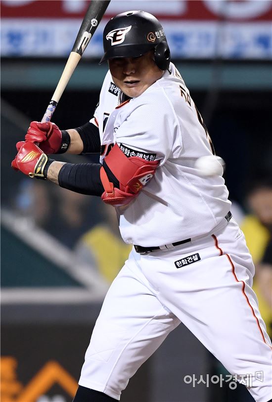 [대전=아시아경제 김현민 기자]프로야구 KIA 타이거즈와 한화 이글스의 2017 KBO리그 경기가 24일일 대전구장에서 열렸다. 9회말 한화 선두타자 김태균이 KIA 홍건희의 투구를 몸에 맞고 있다. 김태균은 연속 경기 출루 기록을 77경기로 늘렸다.