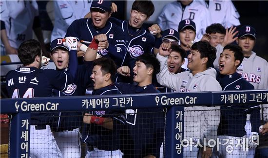 [아시아경제 김현민 기자]프로야구 두산 베어스와 LG 트윈스의 2017 KBO리그 경기가 일 잠실구장에서 열렸다. 7회초 2사 1,2루에서 두산 에반스가 LG 최동환을 상대로 동점 3점 홈런을 치고 동료들과 기뻐하고 있다.