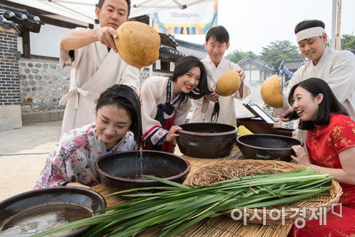 [아시아경제 윤동주 기자] 단오(음력 5월 5일)을 맞아 28일 서울 중구 남산골한옥마을을 찾은 시민들이 각국의 전통의상을 입고 청포물 머리감기 체험을 하고 있다. 남산골한옥마을은 이번 행사를 통해 ‘한중일 <단오>로 한옥마을에서 만나다’를 주제로 이웃나라 중국과 일본의 단오 문화를 비교 체험할 수 있는 다양한 프로그램을 준비했다.
