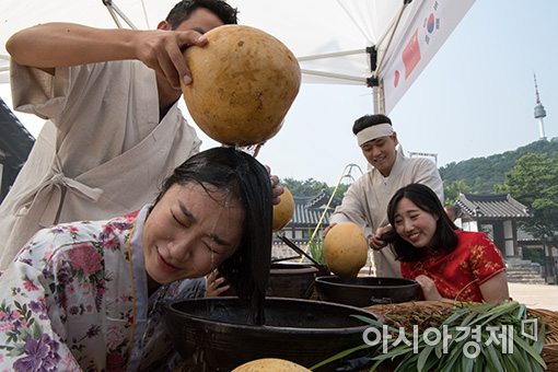 [아시아경제 윤동주 기자] 단오(음력 5월 5일)을 맞아 28일 서울 중구 남산골한옥마을을 찾은 시민들이 각국의 전통의상을 입고 청포물 머리감기 체험을 하고 있다. 남산골한옥마을은 이번 행사를 통해 ‘한중일 <단오>로 한옥마을에서 만나다’를 주제로 이웃나라 중국과 일본의 단오 문화를 비교 체험할 수 있는 다양한 프로그램을 준비했다.