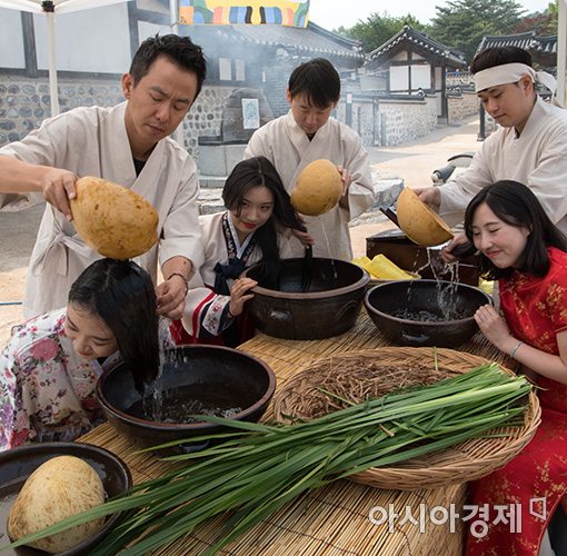 [아시아경제 윤동주 기자] 단오(음력 5월 5일)을 맞아 28일 서울 중구 남산골한옥마을을 찾은 시민들이 각국의 전통의상을 입고 청포물 머리감기 체험을 하고 있다. 남산골한옥마을은 이번 행사를 통해 ‘한중일 <단오>로 한옥마을에서 만나다’를 주제로 이웃나라 중국과 일본의 단오 문화를 비교 체험할 수 있는 다양한 프로그램을 준비했다.