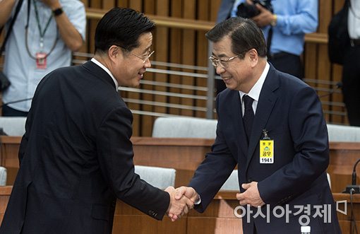 [아시아경제 윤동주 기자] 서훈 국정원장 후보자가 29일 국회에서 열린 인사청문회에 출석, 이태규 국민의당 의원과 인사를 나누고 있다.