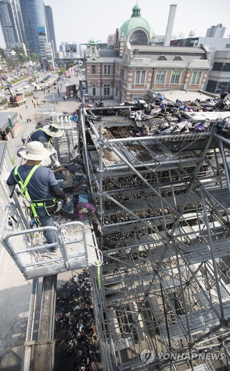 서울시에 따르면 '서울로7017'의 개장을 기념해 만들어진 황지해 작가의 작품 '슈즈트리'가 9일간의 전시를 마무리하고 29일 오후 철거에 들어갔다.