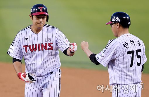 [아시아경제 김현민 기자]프로야구 넥센 히어로즈와 LG 트윈스의 2017 KBO리그 경기가 31일 잠실구장에서 열렸다. 4회말 무사 1루에서 LG 김재율이 우전 안타를 치고 한혁수 코치와 하이파이브하고 있다.