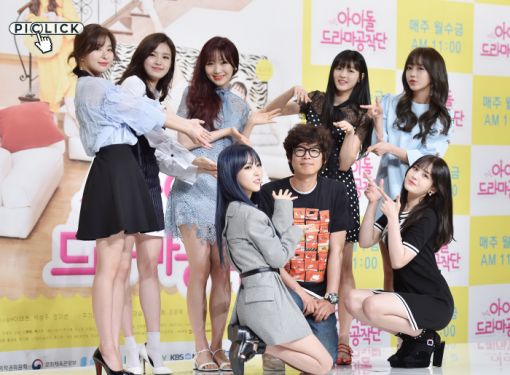 6월 1일 오후 서울 영등포구 영등포동 타임스퀘어 아모리스홀에서 KBS 웹 예능 ‘아이돌 드라마 공작단’(연출 고국진, 이하 아드공)의 제작발표회가 열렸다. 이 자리에 그룹 마마무 문별, 레드벨벳 슬기, 러블리즈 수정, 오마이걸 유아, 소나무 디애나. 전소미, 김소희, 고국진 피디가 참석해 포토타임 포즈를 취하고 있다.