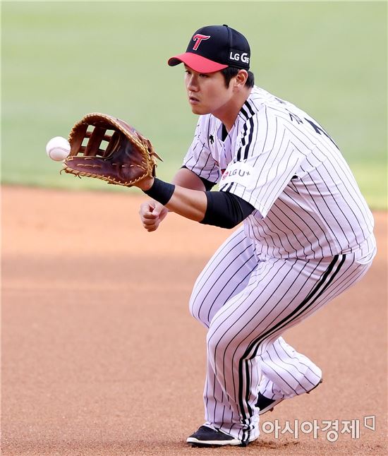 [아시아경제 김현민 기자]프로야구 넥센 히어로즈와 LG 트윈스의 2017 KBO리그 경기가 1일 잠실구장에서 열렸다. LG 1루수 김재율이 1회초 넥센 선두타자 고종욱의 타구를 수비하고 있다.