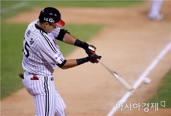 [아시아경제 김현민 기자]프로야구 넥센 히어로즈와 LG 트윈스의 2017 KBO리그 경기가 1일 잠실구장에서 열렸다. 7회말 2사 만루에서 LG 채은성이 추가 2타점 적시타를 치고 있다.