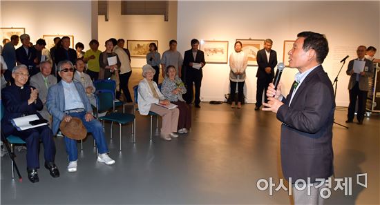 [아시아경제 노해섭 기자]윤장현 광주광역시장이 2일 오후 북구 광주시립미술관에서 열린 아산 조방원전 개막식에 참석해 축사를 하고 있다. 오는 8월 15일까지 시립미술관 본관 제1, 2전시실에서 열리는 이번 전시회는 아산 조방원의 회화 작품 100여점과 컬렉션 및 자료 50여점이 선보인다.