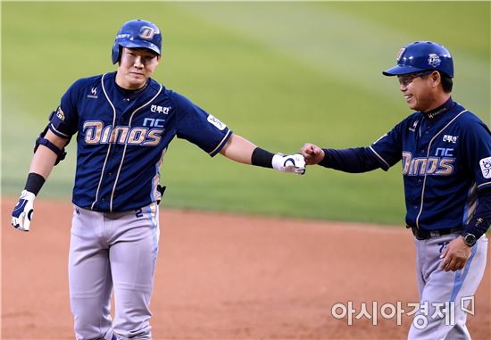 [아시아경제 김현민 기자]프로야구 NC 다이노스와 LG 트윈스의 2017 KBO리그 경기가 2일 잠실구장에서 열렸다. 3횣초 1사 2루에서 NC 박민우가 선취 1타점 적시타를 치고 전준호 코치와 하이파이브하고 있다.