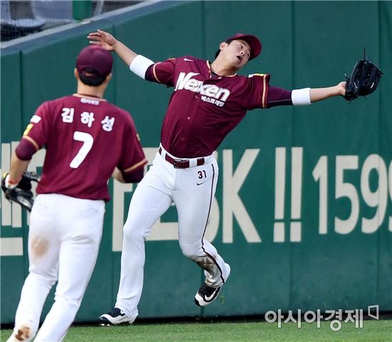 [인천=아시아경제 김현민 기자]프로야구 넥센 히어로스와 SK와이번스의 2017 KBO리그 경기가 7일 인천 SK행복드림구장에서 열렸다. 4회말 무사에서 넥센 좌익수 허정협이 SK 로맥의 파울 타구를 잡아내고 있다.