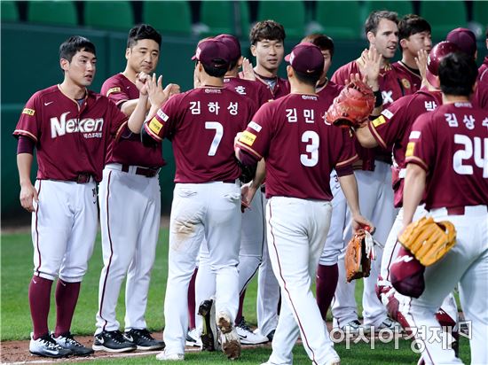 [인천=아시아경제 김현민 기자]프로야구 넥센 히어로스와 SK와이번스의 2017 KBO리그 경기가 7일 인천 SK행복드림구장에서 열렸다. 넥센 선수들 6-2 승리를 확정한 뒤 기뻐하고 있다.