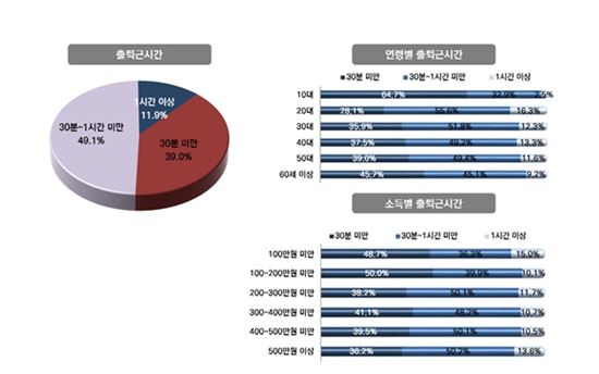 출퇴근 시간이 30분 이상 1시간 미만인 경우는 49.1%로 그 비율이 가장 높았다. 이어 30분 미만(39.0%), 1시간 이상(11.9%) 순이었다.