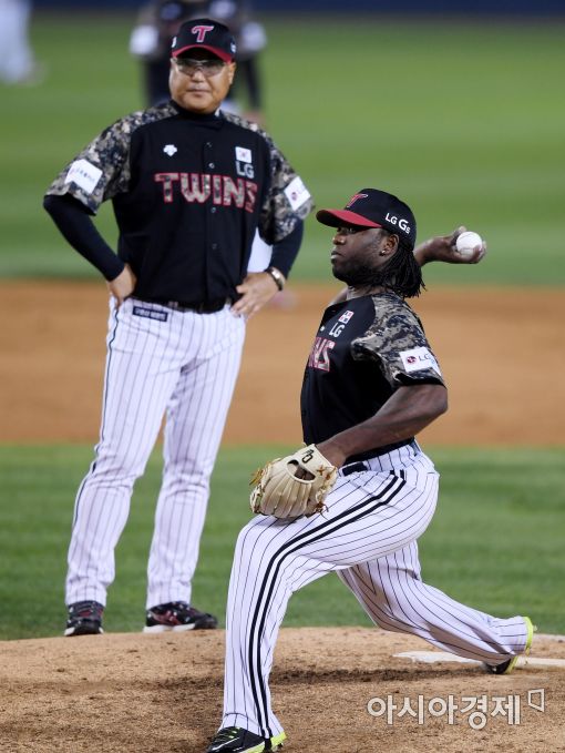 [아시아경제 김현민 기자]프로야구 SK 와이번스와 LG 트윈스의 2017 KBO리그 경기가 9일 잠실구장에서 열렸다. 8회초 LG 소사가 구원 등판해 역투하고 있다.
