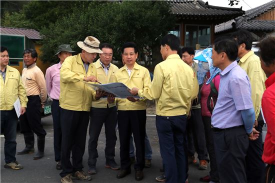 [아시아경제 노해섭 기자]전동평 영암군수가 지난 9일 가뭄으로 어려움을 겪고 있는 영농현장을 방문해 농민들을 위로하고 가뭄 피해 최소화에 총력을 다 할 것을 밝혔다. 사진제공=영암군