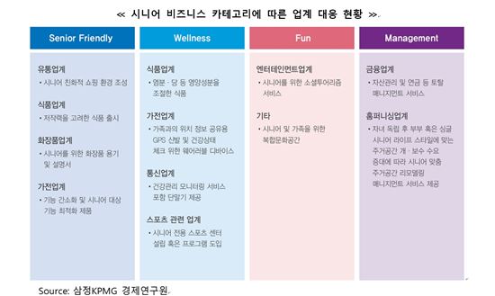 삼정KPMG 경제연구원의 김광석 수석연구원은 “본격적인 고령 사회가 도래함에 따라 앞으로 시니어 시장의 규모가 더욱 커질 것이며 기업들은 이를 고려하여 장기적인 시각으로 시니어 시장에 접근해야 한다”고 조언했다. 이어 “지금의 시니어를 고객으로 확보하는 것도 중요하지만, 현재의 중년층이 향후 시니어 소비자가 될 것이라는 사실을 염두에 두고 전략을 모색할 필요가 있다”고 설명했다.