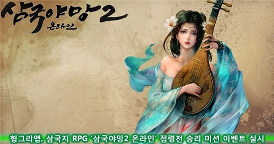 이번 미션에 참여하고자 하는 유저는 매주 월, 수, 금요일 밤 10시에 진행되는 점령전에 참여 후 다른 군단 유저와의 대결에서 승리하고 이를 캡처해‘인증관’ 게시판에 게재하면 된다. 본 이벤트는 6월 18일까지 진행되며, 추첨을 통해 10명에게 바나나맛 우유 기프티콘을 증정한다. 이벤트에 관한 보다 자세한 사항은 ‘헝그리앱 미션’ 또는 ‘삼국야망2 온라인 헝그리앱’에서 확인할 수 있다.