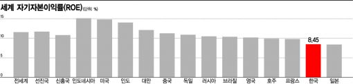 16일 대신증권 등 금융투자업계에 따르면 지난해 한국시장의 자기자본이익률(ROE)은 8.45%로 모건스탠리캐피털인터내셔널(MSCI) 기준 선진국 그룹 11.69% 대비 3.24%포인트 낮다. 신흥국 10.81%와 비교해서도 2.36%포인트 낮다. ROE는 투입한 자기자본이 얼마만큼의 이익을 냈는지를 나타내는 지표다.